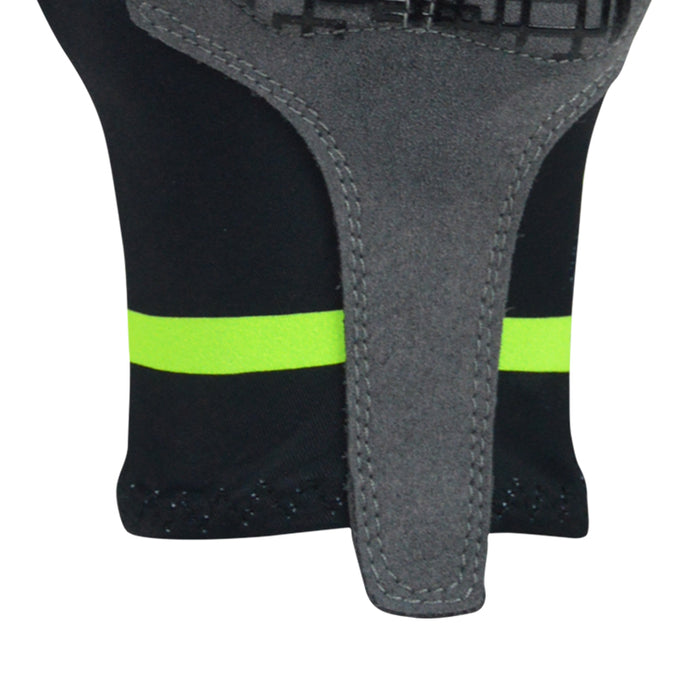 The rest of the glove except the palm is made of stretchy Lycra fabric. Extra-long microfiber leather covers the wrist for easy wearing and extra protection.