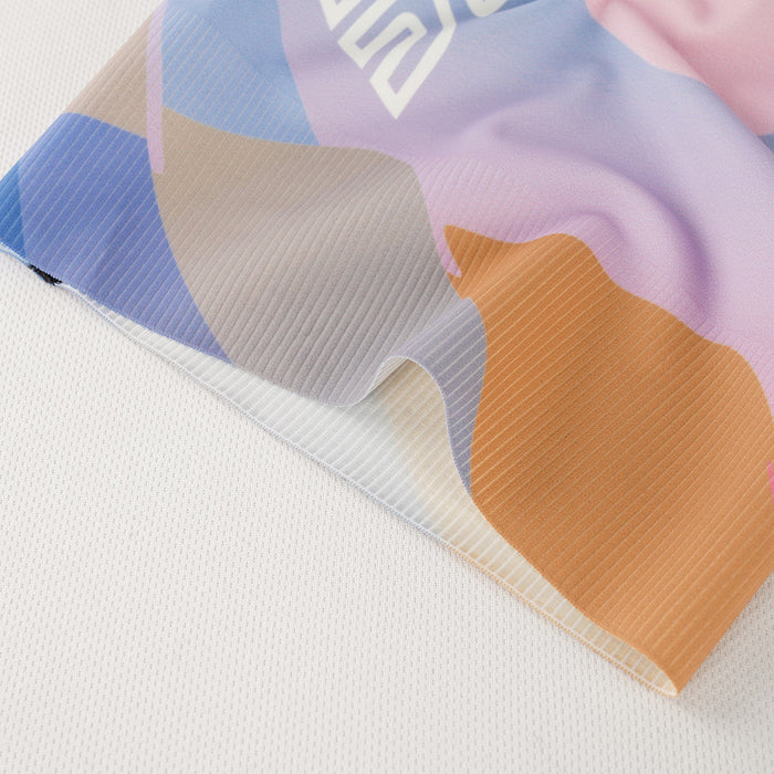 Featuring a black saddle-supporting zone contrasted with vibrant pastel color-blocking (gradient pink, blue, orange), this cycling bib combines wide white shoulder straps in ultra-soft stretch fabric for secure, pressure-free support. The bold geometric panels merge performance with style for an effortless ride.