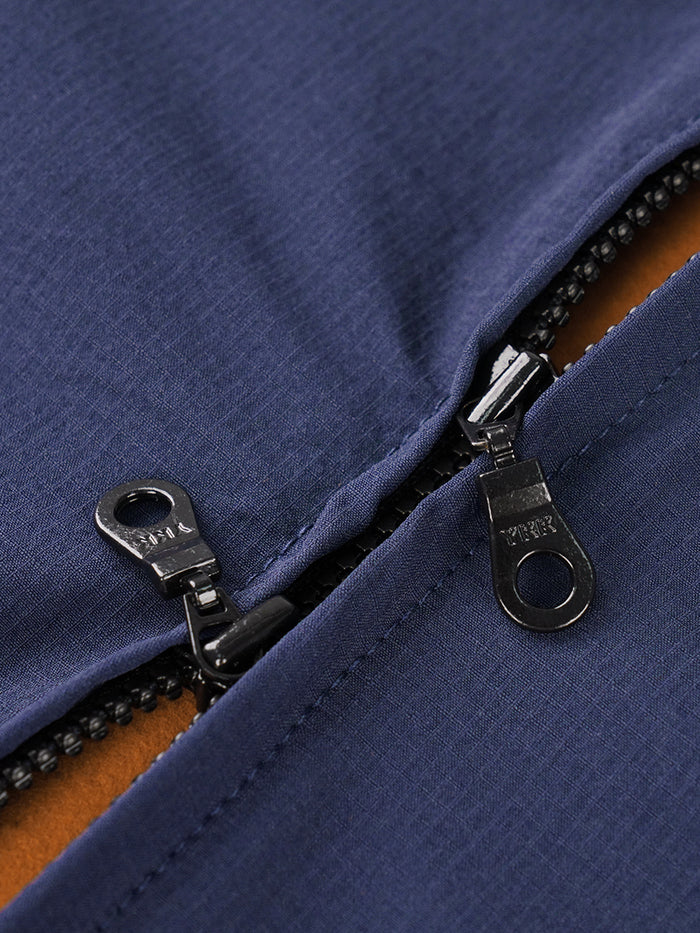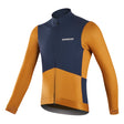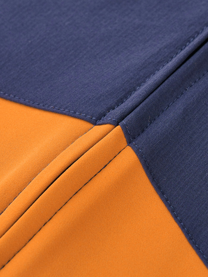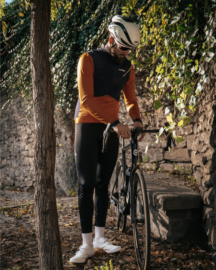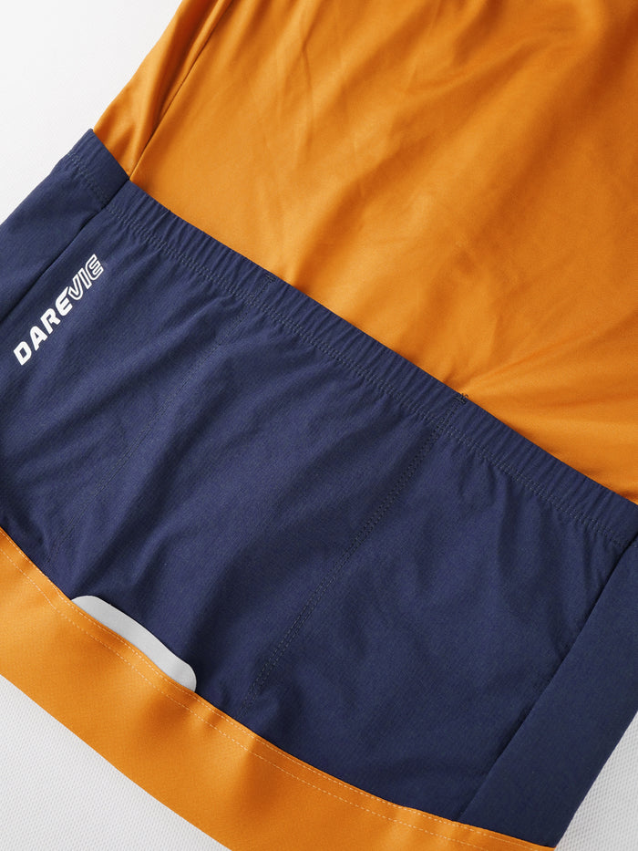 Dual-Fabric Performance Design, deep navy 4-way stretch woven nylon front for wind and water resistance, with lightweight orange thermal fabric elsewhere for warmth and breathability. YKK double slider zipper and anti-slip hem block cold air, while the 3+2 pocket system holds energy gels and essentials. Reflective rear details enhance visibility, making the Zephyr versatile for autumn and winter rides.